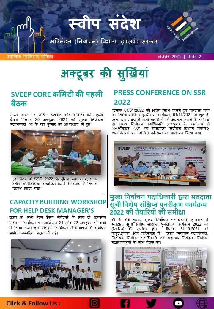 After the creation of the officer, the bye-election of Ramgarh Assembly and bye-election of Dumka Parliamentary elections were successfully conducted. The bye-election of Godda Parliamentary seat is scheduled to be held on 12-12-2002 for which the preparations are going on.